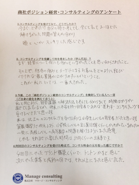 「売上と利益を上げていくことを今までは、計算できなかったのですが、今では計算できるようになり、先行きに対しても楽観できるようになりました。」