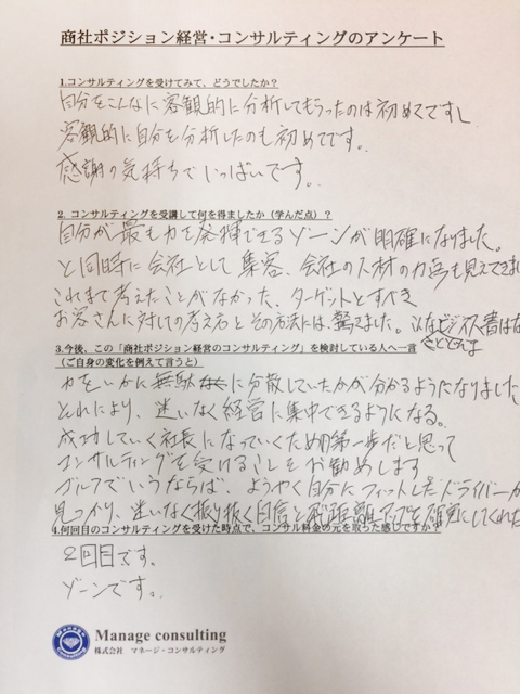 「力をいかに無駄に分散していたかがわかるようになりました。それにより、迷いなく経営に集中できるようになりました。自分が最も力を発揮できるゾーンが明確になりました。」